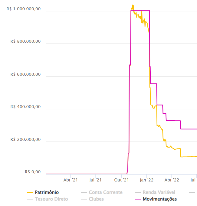 Acima você a vê a linha rosa, com as entradas e retiradas de capital pelo investidor e a linha amarela, com a variação de mercado desse capital.